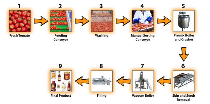ورود گوجه ==> شستشو و سورتینگ ==> خردکردن ==> پخت اولیه ==> پالپ کردن و صاف کردن ==> تغلیظ (تبخیر تحت خلا) ==> پاستوریزاسیون ==> بستهبندی ==> دربندی و لیبلزنی ==> پالتینگ و انبارش